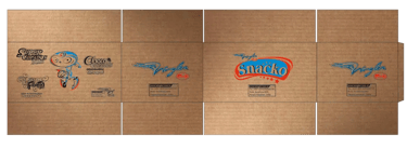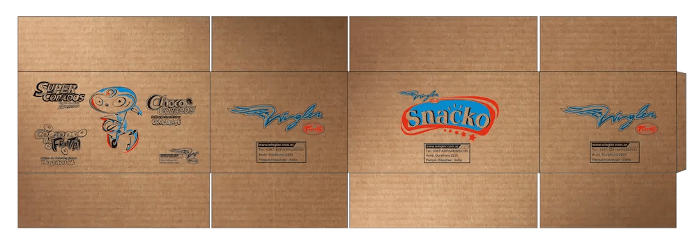 Sistema gráfico aplicado a cajas de cartón mediante impresión serigráfica, manteniendo claridad y reconocimiento de marca.